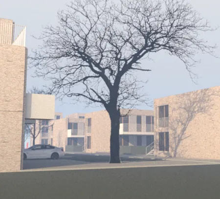 Illustrationen er fra et projekt på Tæbyvej i Rødovre; 19 boliger i en kombination af etageboliger og rækkehuse.