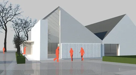 Igangværende ombygning af Asminderød sognegård i Fredensborg, og illustration af mulighed for senere udvidelse.
