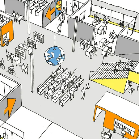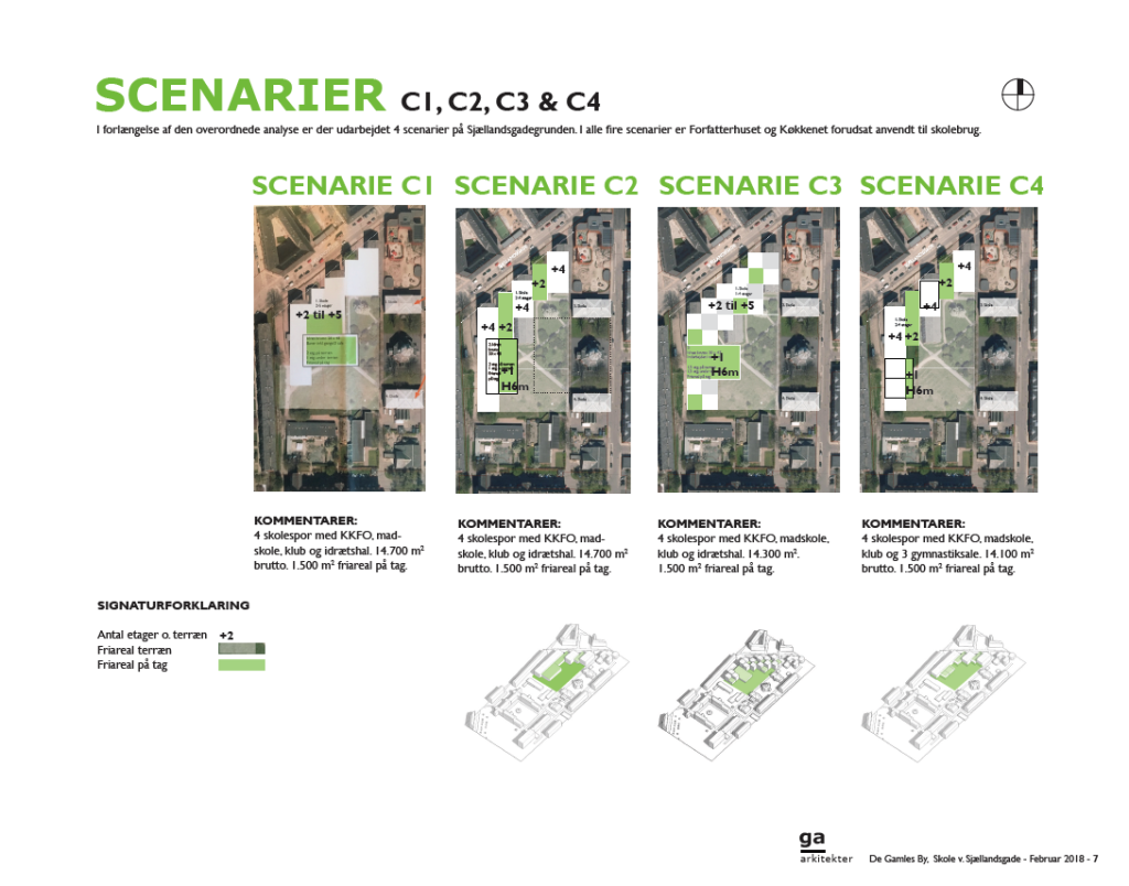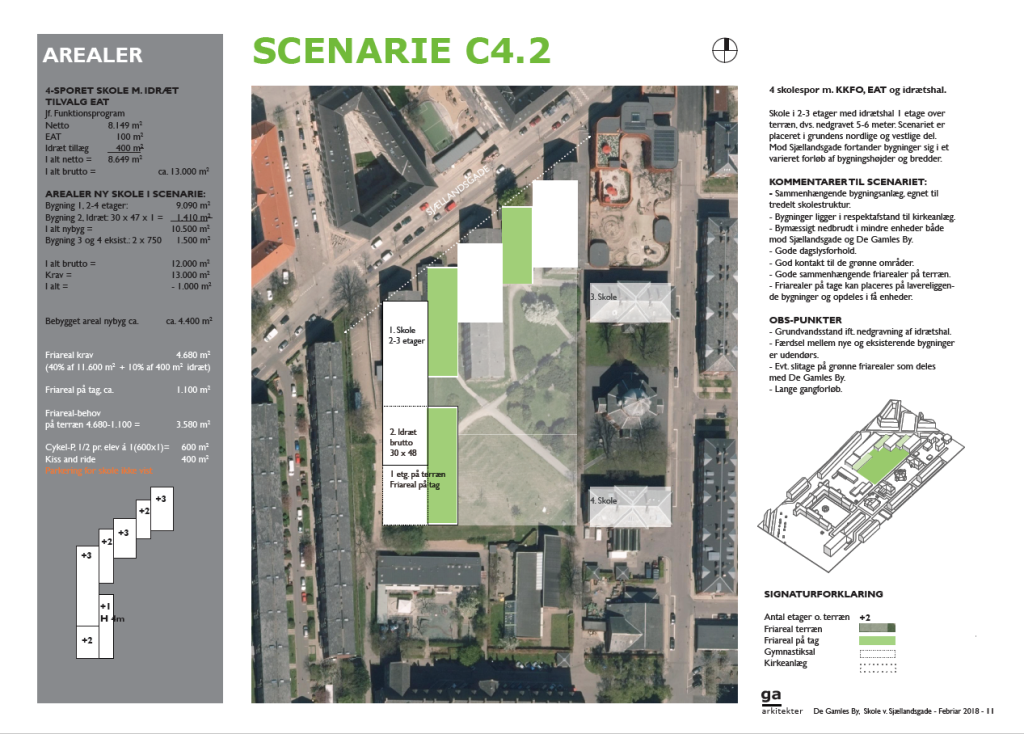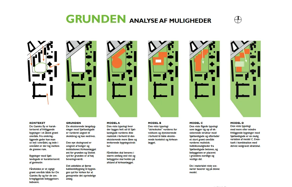 En helhedsplan eller forundersøgelse af en eksisterende skole indeholder både overordnet analyse af alle skolens lokaler og evt. også skitser til mulige fremtidsscenarier (som her nedenfor).