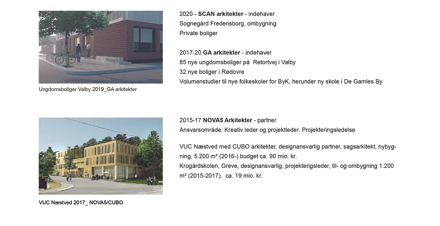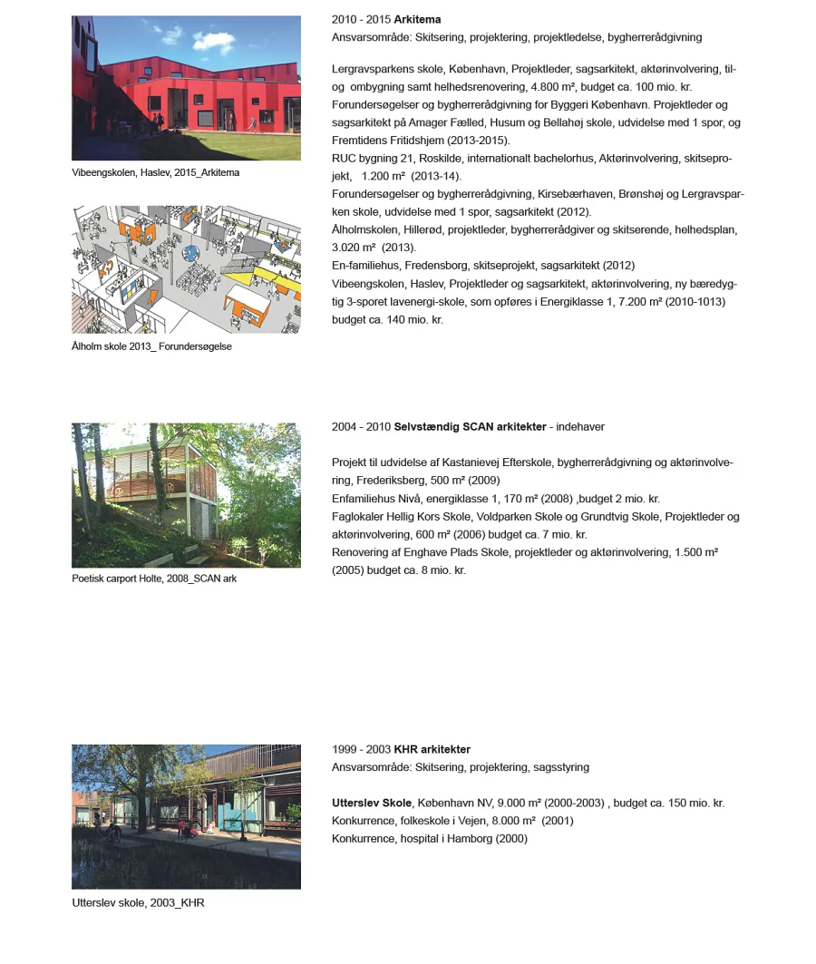 Som indehaver, partner, projektleder og sagsarkitekt har Susanne Andersen haft det arkitektoniske ansvar for en række markante projekter inden for såvel offentligt som privat byggeri. Susanne behersker alle facetter af kunde- og brugerinddragelse i den kreative proces og anvender den indhentede viden som en bærende faktor i udviklingen af projekternes arkitektur.